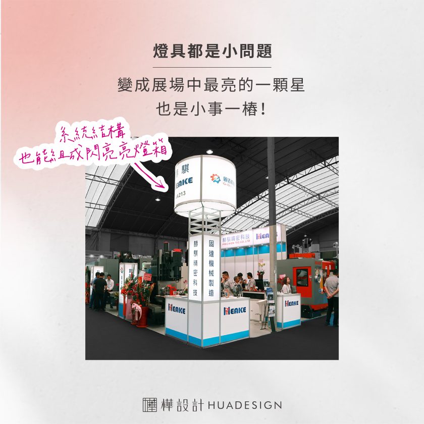 系統組合的零件多元化設計與結構本身都與燈具十分相容,很適合搭配水電打造成各式燈箱,輕鬆創造吸睛的展示效果,不愧是展場人氣王。另外,搭配壓克力及中空板也是近年流行的設計,為攤位營造出另一種氛圍。