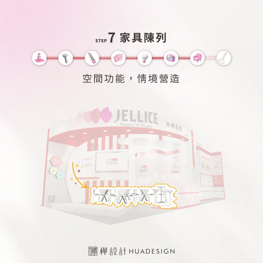 家具的挑選及擺放也影響到觀眾的參觀體驗。事前就需要考慮到功能性、舒適度與美觀的平衡,並且確保每一件家具的放置都不影響整體動線。合理的家具佈局不僅能提升空間的功能性,有效劃分展示區與洽談區域,還能讓參觀者有更多舒適的休息區及交流空間。