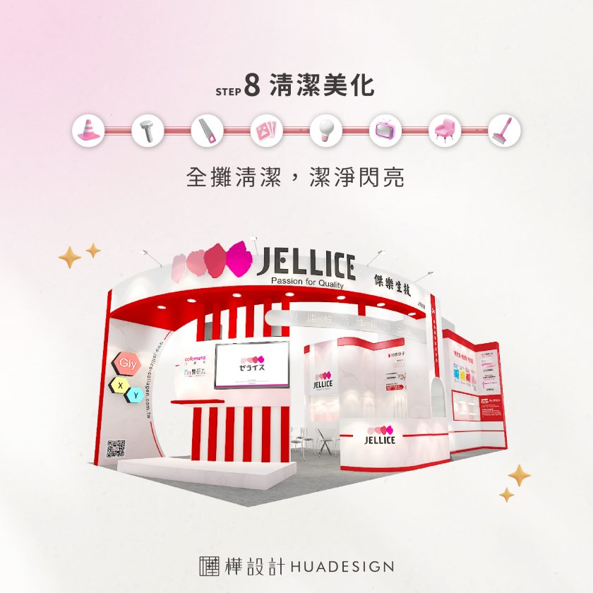 在施工的最後階段,清潔與美化工作至關重要。讓展位無任何雜亂,為開幕提供最好的印象,並進行最後的細節檢查,確保每個細節都無遺漏,讓整體展覽呈現出最專業的面貌。周邊道具及餐飲需求也都會在攤位完工並清潔打理後做最後的定位。